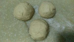 取出面团,撒干粉防粘。揉搓面团,完全排气,将面团三等分,滚圆松弛10分钟。