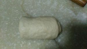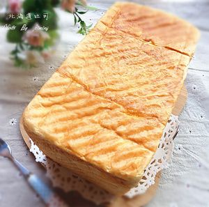 继续将面卷擀薄擀长,压薄底边,宽度与土司盒等宽,收口向上。