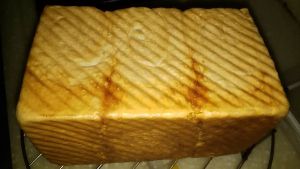 取出吐司盒,摔两下。立即将吐司取出,放在烤网上,彻底将吐司放凉再切片。
