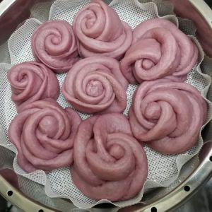 温水泡酵母,水温在38度以下哦,别把酵母烫了,糖和到面粉中拌匀。等待紫薯蒸好后摊凉一点,不烫手为准。