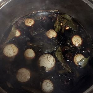 大火开始煮开,中火五分钟,翻滚一下鸡蛋,让下面的上来呼吸新鲜空气,放入点鸡精。小火再来个十来分钟,中间再让鸡蛋翻滚一下,这样入味。