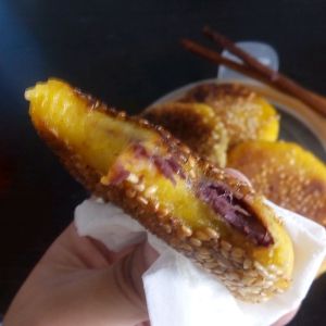 紫薯蒸熟以后加人一点红糖搓成圆形备用,当然也可以用白糖,我觉得白糖火,而红糖补血,所以就选红糖了