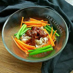 装面,放上拌面的葱段,胡萝卜丝和酱肉丝,洒白芝麻和辣椒~