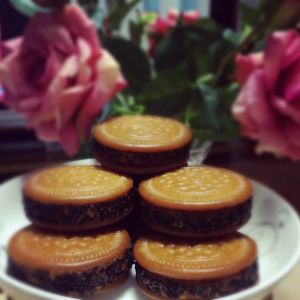 取适量南瓜面团放在两块饼干中间,周边裹上一层白芝麻(我只有黑芝麻,所以不好看,不过不影响口感就OK),饼干和面团要压紧哦~