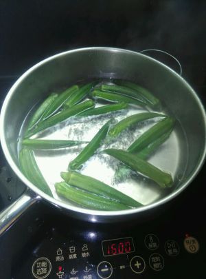 水烧开后,放入秋葵,倒入少许米醋(米醋可以保持秋葵颜色翠绿翠绿的),灼1分钟