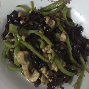先把肉丝炒熟,加入辣椒和黑木耳丝炒(黑木耳炒的时候会爆加入一点点水就不会了)根据个人口味加入糖和醋(我加了两勺糖三勺醋)(注意:醋最好比糖多一勺)