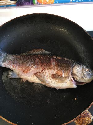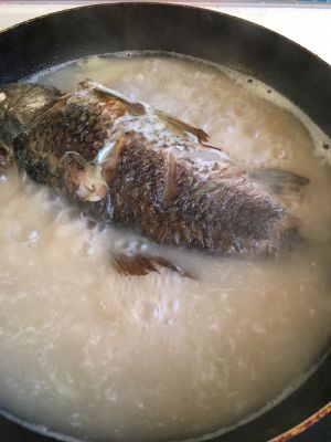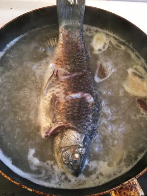 两面金黄,加开水,鱼身一半水量,再放葱段,姜片