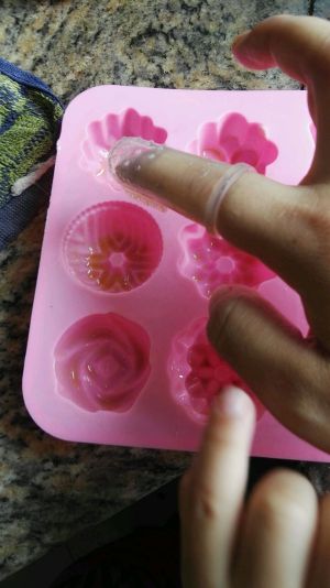用来做布丁的磨具均匀的用手抹油,儿子在旁边也想插手来着