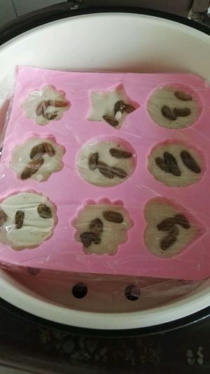 最后倒入磨具8分满即可,蒸的过程中留有上升空间.电饭煲里加水,按蒸煮键,大约20分钟就好了.出磨时用蓝莓酱点缀一下