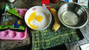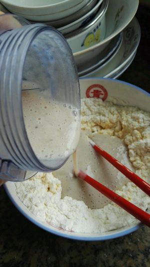 牛奶75ml加香蕉段放入搅拌机里打成汁,然后和面粉鸡蛋一起搅拌匀称