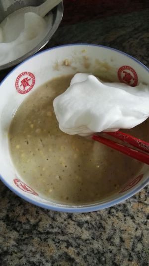 最后把蛋清分3次放入香蕉糊碗里搅拌,每放一次拌一次,这样蛋糕液会更均匀细腻