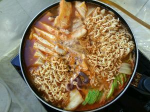 5.待锅内食材8分熟时,放入辣白菜,方便面,继续煮到开锅,食材全熟就可以吃啦,要就着锅吃才有感觉哦!