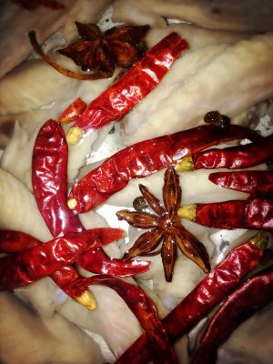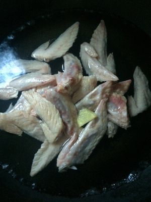 另起锅加水.放入鸡翅.花椒.八角.干辣椒.姜片.料酒.酱油.糖大火煮开转小火焖煮