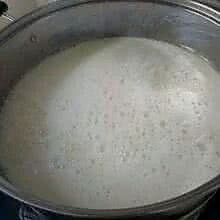 豆浆倒入适当容器煮沸并保持沸腾状态2分钟,换小火,用小勺逐次将浆水菜汁顺容器边倒入,直至大豆蛋白凝结时止,整个凝结过程不搅动。直到最后豆花聚集,剩余汤水变的清澈不在有豆浆的痕迹。