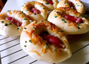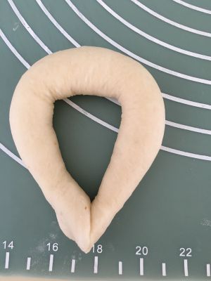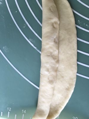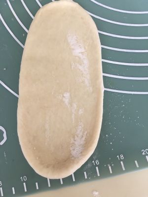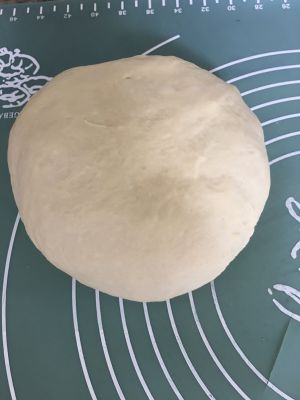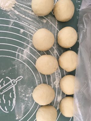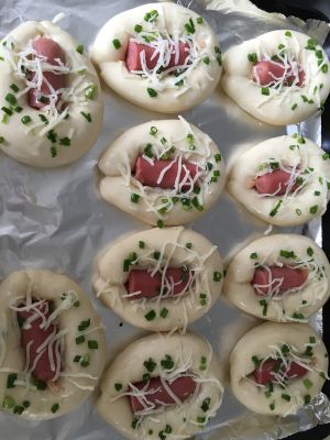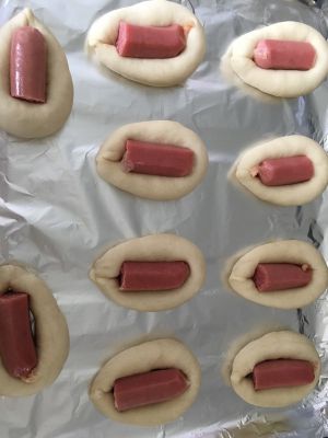放入烤盘中并且将火腿肠放在面团中间,发酵到二倍大