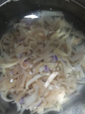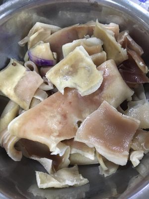 肉皮洗净,冷水下锅,加黄酒,煮开,打卷,捞出,过凉。