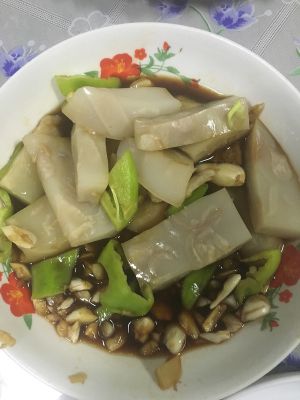 成型后切片,拌入凿碎的蒜,糖,醋,酱油,几滴香油。爱吃辣加入一个切碎的尖椒。