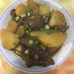 把土豆倒入牛肉里,大火开后再小火煲十分钟,加入盐及鸡精