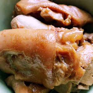 煮好的猪手用温水浸泡片刻,进行深度清洗。