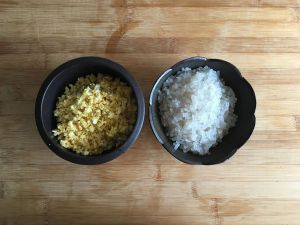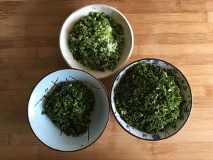 将青蒜苗和香菜清洗干净沥干水分剁碎。尽量剁的很细很碎。