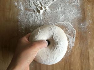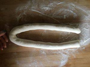 用大拇指在面团的中间部位戳个洞。双手将面捏成条状。