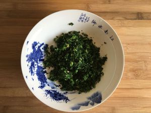 将焯烫过的荠菜挤干水分,剁碎备用。