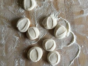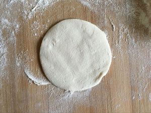 在面剂子上撒少许干面粉防粘,用掌心将面剂子压扁