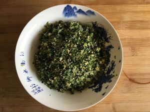 将所有剁碎的食材混合后加人盐、辣椒油、姜末、芝麻油和猪油搅拌均匀。荠菜里加入猪油味道会比植物油更香哦!