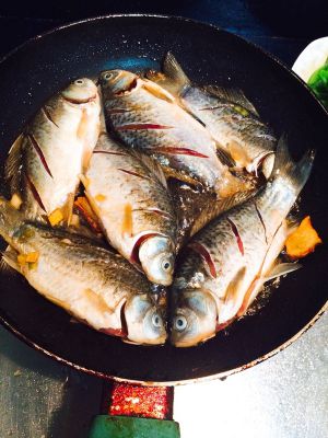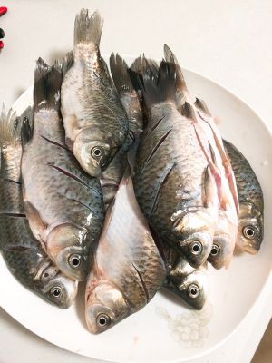 小鲫鱼,去除鱼鳞,去除内脏,用水清洗干净,然后用刀双面斜刀切,拎干