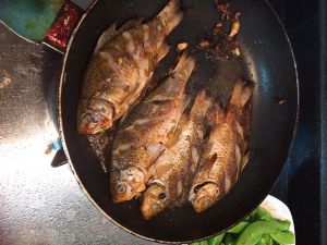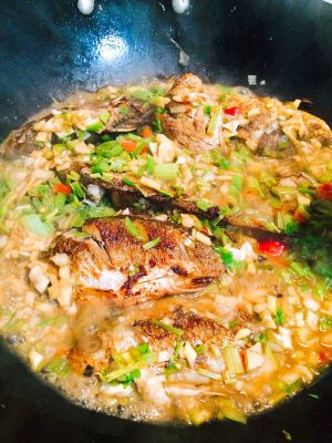 掂锅翻面,这样鱼不容易碎,待芹菜汁没了,将腌制鱼的汤汁放入盖锅盖焖2分钟,如果觉得太干的,可以加点开水盖锅盖焖1分钟即可出锅