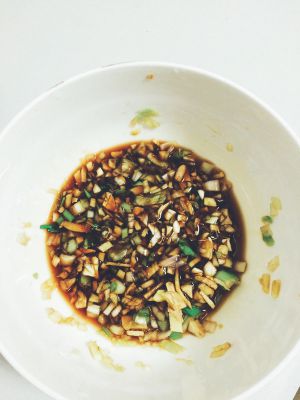 大蒜头切碎,大葱切碎,生姜可根据自己喜欢切丝切片切碎都可以,然后放碗里,加黄酒,加盐,加鲜酱油拌拌
