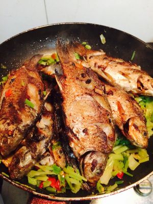 待芹菜炒软,放入鱼,食材多,锅小,咱换大锅