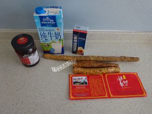 准备好食材:铁棍山药360克,草莓酱40克,淡奶油20克,牛奶60克。
