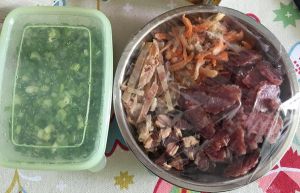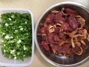 將蔥跟臘肉、臘腸、魷魚干之類洗乾淨切好放一旁備用