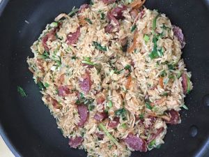 糯米變軟後加入炒好的臘腸、蝦米、臘肉進去一起翻炒均勻加入一點點水蓋上鍋蓋燜煮幾分鐘
