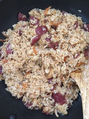 將泡好的糯米倒進鍋裡開始翻炒(一定要勤翻炒不然會糊)一邊炒一邊加入高湯或清水(一次加一點然後炒至水分被吸收再加水繼續翻炒重複動作)直至糯米炒至變軟炒的過程中加入少量醬油跟蠔油不要放太多因為臘腸、臘肉這些本來就有鹹味炒至上色