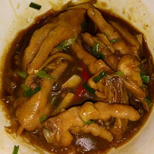 鸡爪直接放锅内(不用放油),再把生姜、大蒜、干辣椒、八角、桂皮、花椒、生抽、老抽、黄酒和鸡爪放一起,再放入开水(也要淹没过鸡爪),开大火煮10分钟左右(快熟之前放葱段),最后放点白糖收汁就可以起锅了!