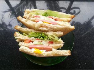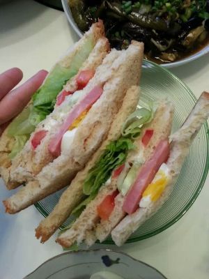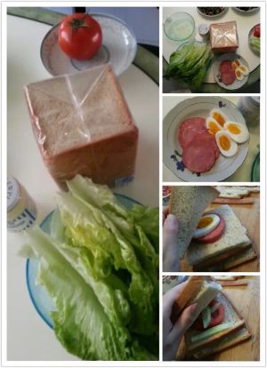 材料准备 三片吐司 把周围的边去掉 只留中间的吐司肉 当然切下来的吐司边可以单独吃 鸡蛋煮到8分熟 刚刚凝结又不会流黄 这样的鸡蛋好吃易吸收 腊肠火腿切片 然后一片吐司上放生菜 再叠一片 上放番茄片和黄瓜 加沙拉酱 再叠一片放火腿和鸡蛋 压实后 用到斜切成两半