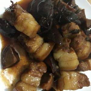把五花肉,香菇放入锅中,倒入老抽,料酒,冰糖少许,还有八角,最后倒入开水盖过五花肉!