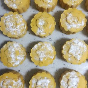 蒸好的南瓜泥加糯米粉和至软硬适中的面团,与豆沙一同分成大小均匀的剂子待用。