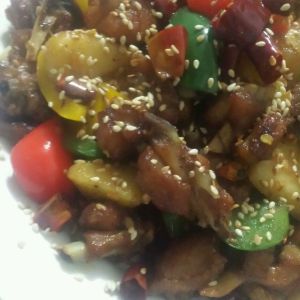 出锅装盘,撒上熟芝麻,一道美味的果味辣子鸡就做好了。