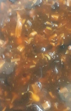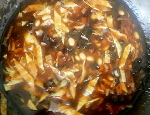锅内放少许油,油内放几粒花椒,用葱姜蒜沬儿炝锅后,炒入切好的香菇,木耳,金针,添水,煮沸后放黄豆,放盐,勾茨,煮熟,关火。