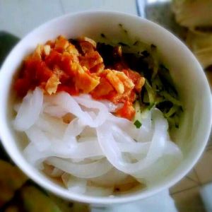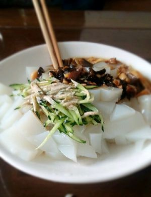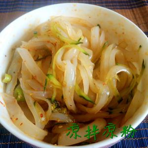 把削好的凉粉放入碗中,浇上卤,撒上黄瓜丝,舀点芝麻酱,滴些芥茉油(芥苿更好,只是家里没有了,只能用芥苿油了),淋入红醋。自制凉粉,可以吃了。