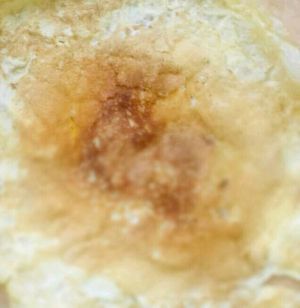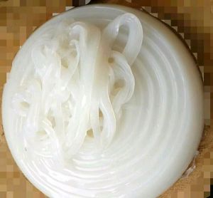 前一天晚上,熬好凉粉坯,冷却一晚,第二天食用。具体作法为,用2份水浸透1份绿豆粉,浸透均匀后,火上烧5份水。水快沸腾时,将浸好的粉全部倒入水中,不停地快速均匀搅动。随着温度不断升高,水粉交融煮熟后呈晶莹剔透的糊状。如图,即可关火,冷却一晚。