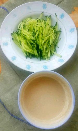 切黄瓜丝儿(越细越好),调麻酱汁。