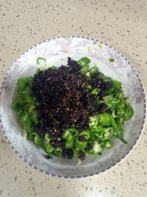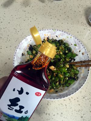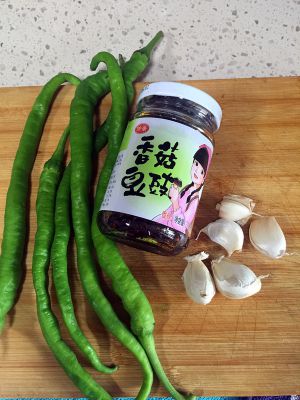 将辣椒切小段,蒜切碎末!加盐稍稍腌制半小时。