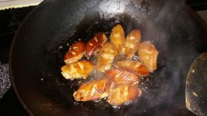 放少量油进锅,鸡翅剔除掉蒜姜碎后进锅,中小火,中途加盖有水蒸气会没那么上火,翻面后煎一会把刚才剩下的姜蒜碎那些再倒进锅,可以加盖。