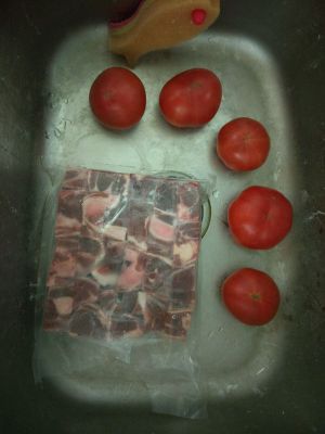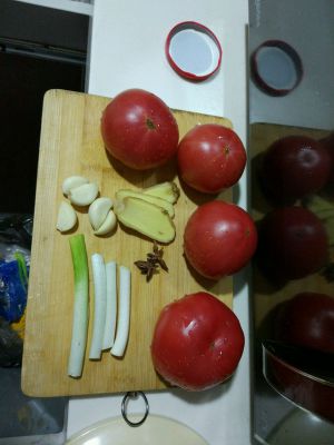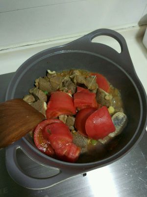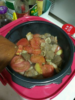 我总共用了四个西红柿,西红柿能出汤汁.不怕缺水,这个时候第一次放盐,不用太多,后面还可以调整