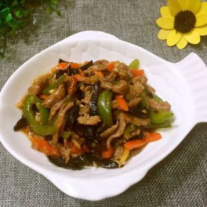 烧至汤汁浓稠时放入木耳、青椒、胡萝卜翻炒至断生。即可装盘食用