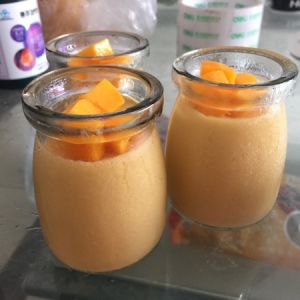 三,加热好的牛奶再稍微放凉,倒入榨好的芒果泥搅拌均匀,用滤网过滤几遍,直到没有泡沫为止。再倒入布丁瓶中,放入冰箱冷藏。